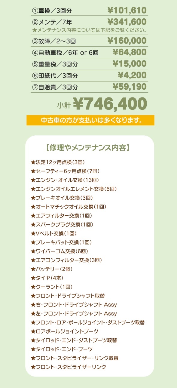 中古車の場合車両料金以外は全て別途ですので、車検や税金、保険などその都度かかります。また、中古車は、車の状態に合わせて故障が起きます。つまり、年数が経つほど、劣化してしまいます。年々維持費が大きくなります。それに伴い、突然の故障などが発生し、修理やメンテ費用がその都度発生していきます。